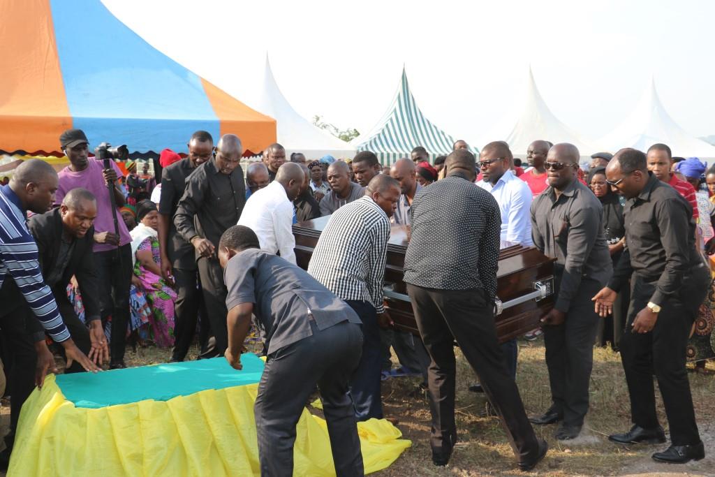 Mkuu wa Mkoa wa Tanga Mhe. Martine Shigela(mwenye suti) na Mkuu wa Mkoa wa Simiyu, Mhe. Anthony Mtaka(kushoto) wakitoa heshima za mwisho kwa mwili wa Bw. Boniphace Maiga Juma aliyekuwa Katibu Tawala wa Wilaya ya Handeni mkoani Tanga ambaye alifariki kwa ajali ya gari Julai 11,2020, kabla ya mazishi yake yaliyofanyika kijiji cha Lyamisanga wilayani Butiama mkoani Mara Julai 13, 2020.