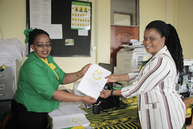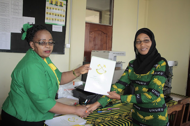 Katibu wa Umoja wa Wanawake wa Chama Cha Mapinduzi (UWT) Mkoa wa Singida, Edina Kiguru, akikabidhi fomu.