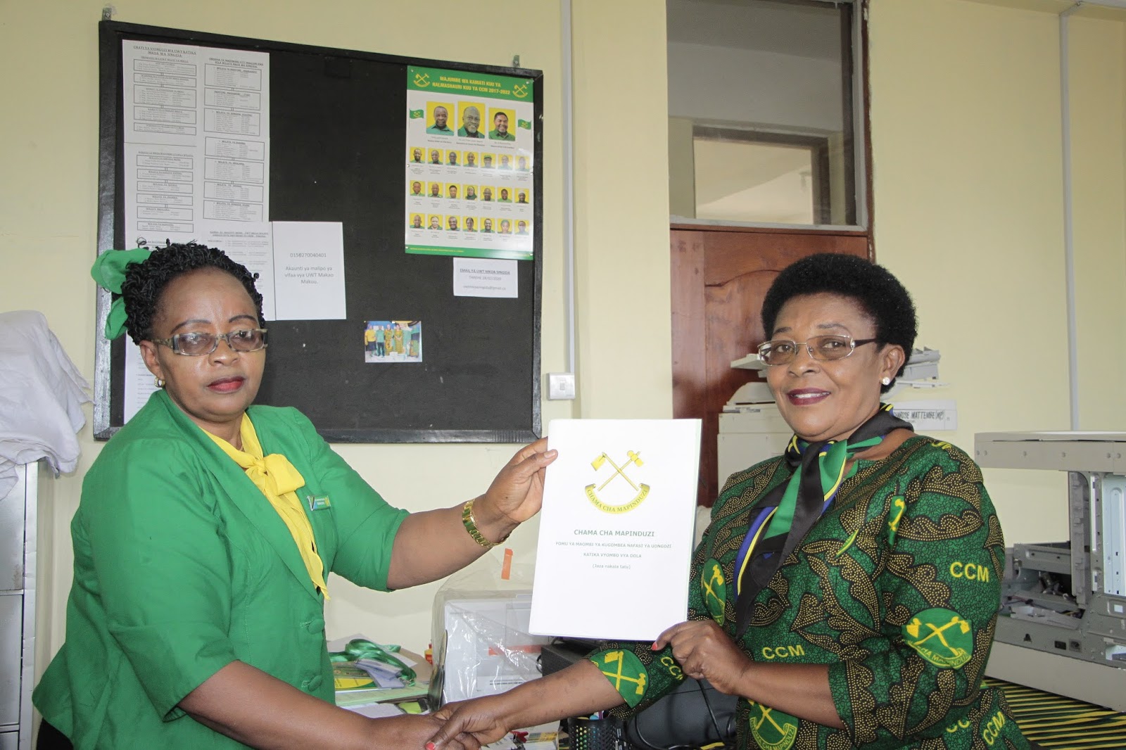 Katibu wa Umoja wa Wanawake wa Chama Cha Mapinduzi (UWT) Mkoa wa Singida, Edina Kiguru (kushoto) akimkabidhi fomu aliyekuwa Mbunge wa Viti Maalumu Mkoa wa Singida, Martha ambaye anatetea nafasi yake.
