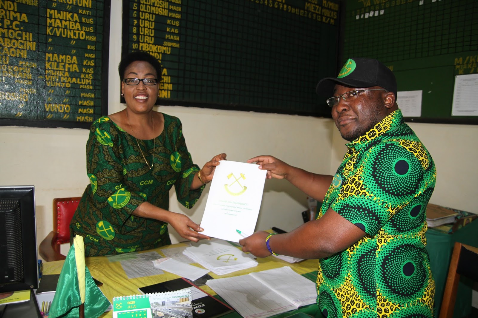 Kada wa Chama cha Mapinduzi Onesti Male akipokea Fomu kutoka kwa Katibu wa CCM Wilaya ya Moshi Vijijini Miriam Kaaya za kuwania nafasi ya Ubunge katika jimbo la Vunjo kupitia Chama Cha Mapinduzi