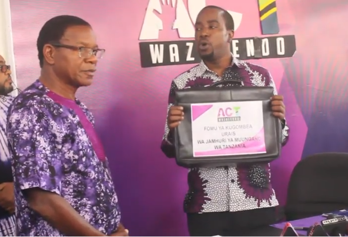 Katibu Mkuu wa chama hicho Ado Shaibu akizungumza kabla ya kumkabidhi fomu za kuomba kugombea urais wa jamhuri ya Muungano wa Tanzania kwa tiketi ya chama cha ACT Wazalendo Bw. Bernald Kamilius Membe leo.