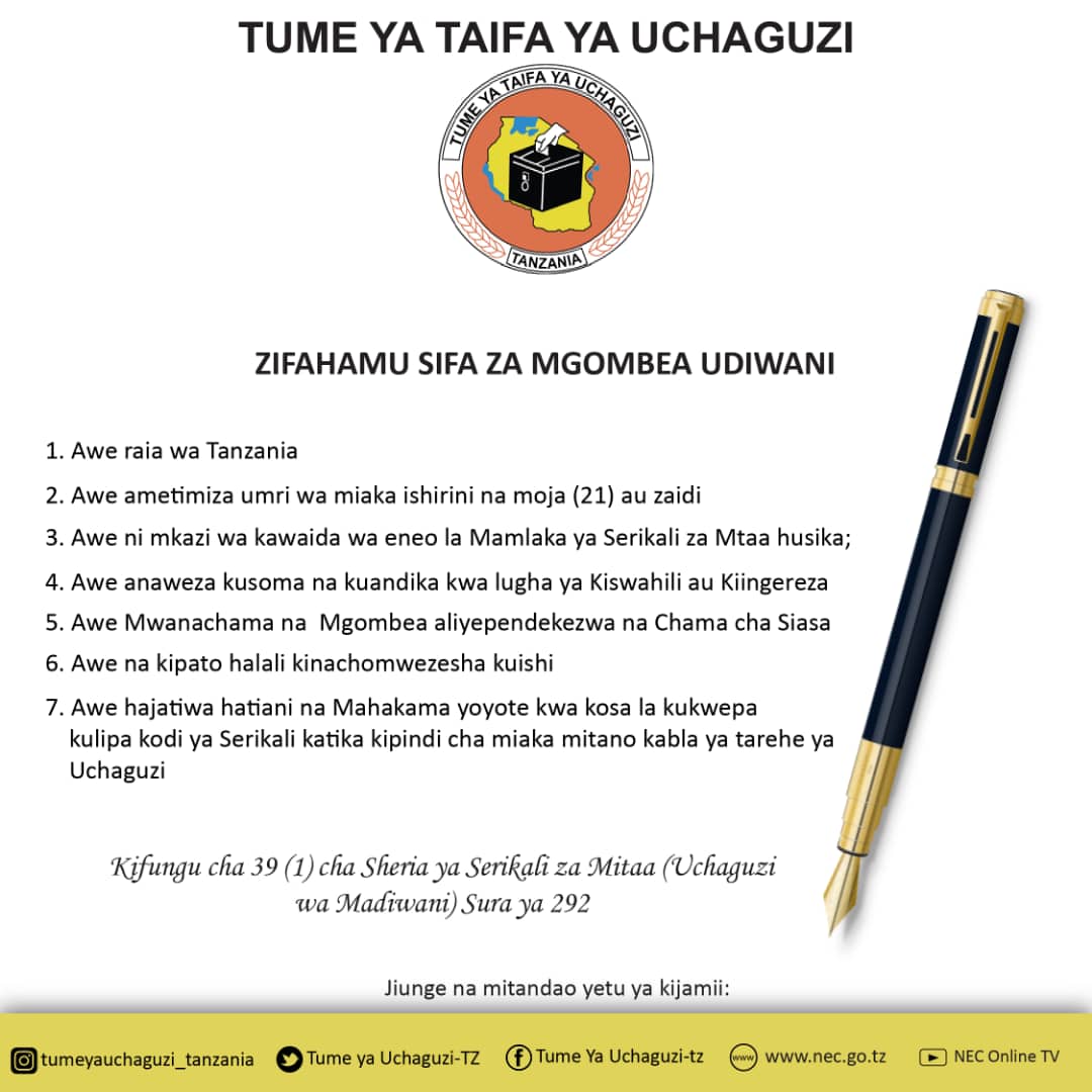 MchanganyikoHIZI HAPA SIFA ZA WAGOMBEA URAIS, UBUNGE NA UDIWANI Last updated: 2020/07/17 at 1:44 PM joseph 5 years ago Share SHARE SIFA ZA MGOMBEA URAIS TANZANIA SIFA ZA MGOMBEA UBUNGESIFA ZA MGOMBEA UDIWANI joseph July 17, 2020 July 17, 2020 Share this Article Facebook Twitter Email Print Previous Article MAMIA WAJITOKEZA KUOMBA RIDHAA YA UBUNGE NDANI YA CCM Next Article UNDP yaipongeza Tume kwa ukuzaji wa haki za binadamu nchini