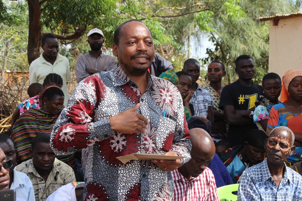 Kiongozi wa Kikundi cha Nyati Mchoya Bw. John Mchoya akitoa ombi kwa Mkurugenzi wa Idara ya Maendeleo ya Utamaduni Dkt.Emmanuel Temu kutoka Wizara ya Habari, Utamaduni, Sanaa na Michezo (hayupo pichani) la kusaidia baadhi ya vikundi visivyo na uwezo wa kujisajili BASATA pamoja na kusaidia vikundi vidogo kupata fursa ya kushiriki shughuli mbalimbali za serikali na matamasha katika ziara ya kutoa Elimu ya Uhifadhi na Uendelezaji wa Urithi wa Utamaduni iliyofanyika katika Kijiji cha Nzali,Kata ya Chilonwa, Dodoma.
