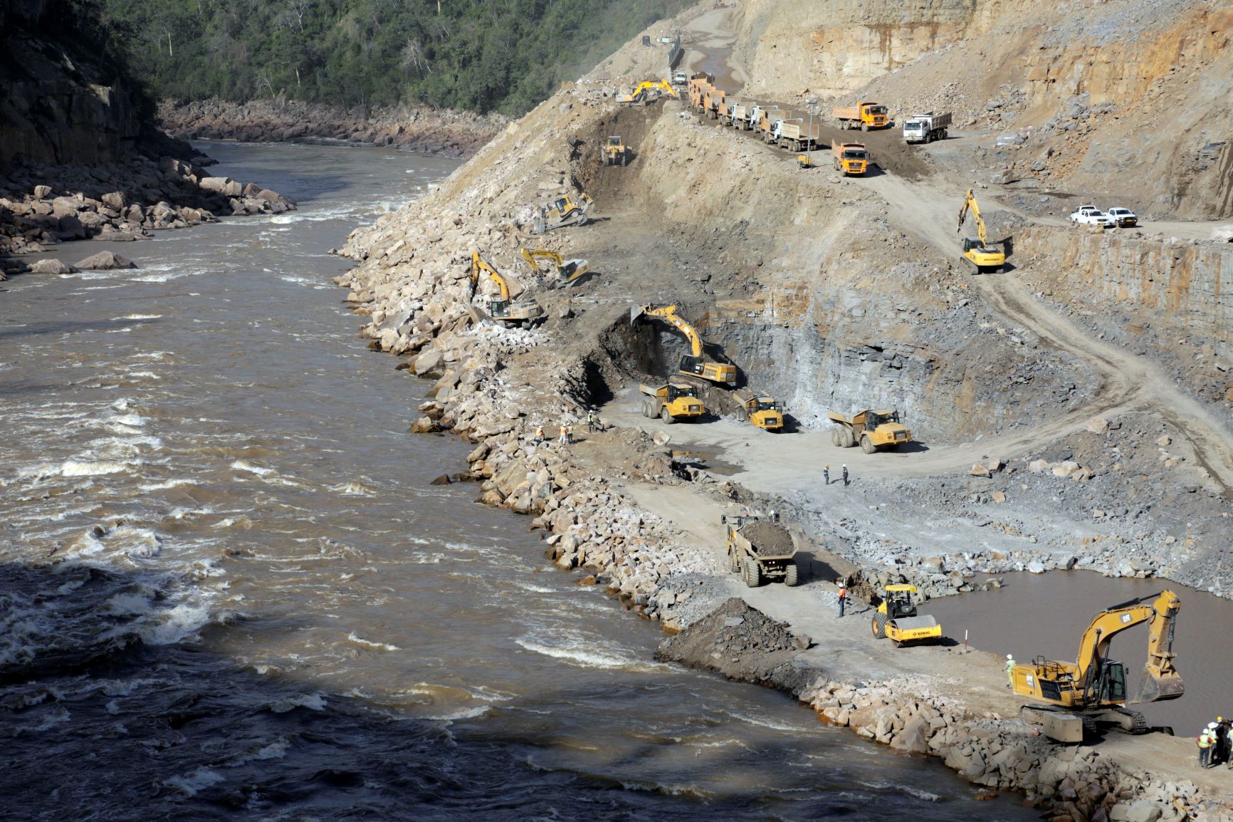 Mashine zikichoronga mlima na malori yakibeba kifusi kwenye bonde la mto Rufiji eneo la mradi wa ujenzi wa bwawa la umeme la Julius Nyerere (JNHPP-MW2115)
