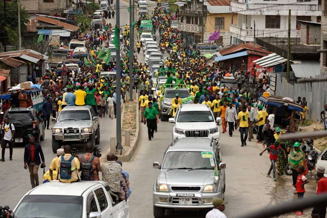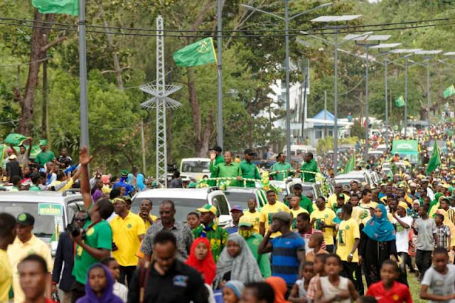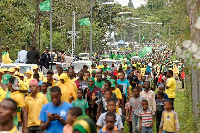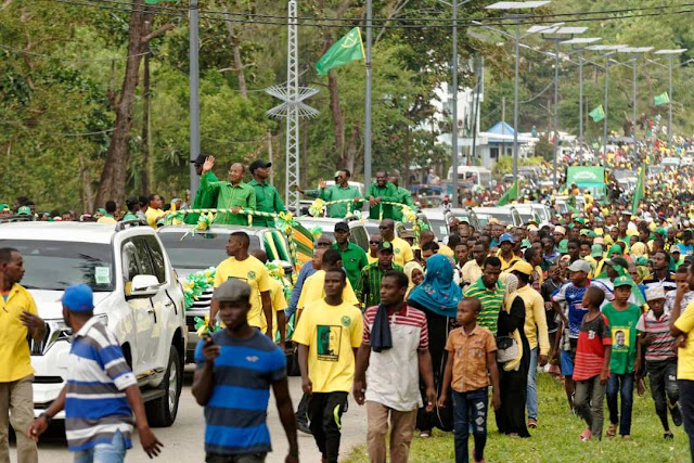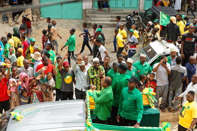 | Mgombea urais wa Zanzibar kupitia tiketi ya Chama Cha Mapinduzi (CCM), Dk. Hussein Ali Hassan Mwinyi (kwenye gari mbele) akiwapungia mkono wananchi na wana-CCM waliojitokeza katika mapokezi njiani. |