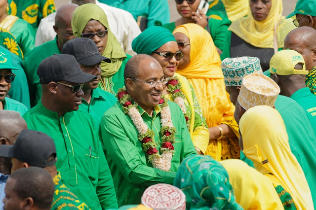 | Mgombea urais wa Zanzibar kupitia tiketi ya Chama Cha Mapinduzi (CCM), Dk. Hussein Ali Hassan Mwinyi (kwenye gari ) akionesha ishara ya kuwashukiuru wananchi waliojitokeza njiani kumpokea. |