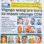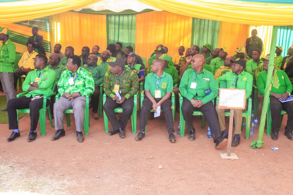 Wagombea 34 wa kiti cha ubunge kwa tiketi ya Chama cha Mapinduzi wakisikiliza maelekezo ya uchaguzi wakati wa kura za maoni katika mkutano mkuu wa Chama cha Mapinduzi jimbo la Karagwe mkoani Kagera