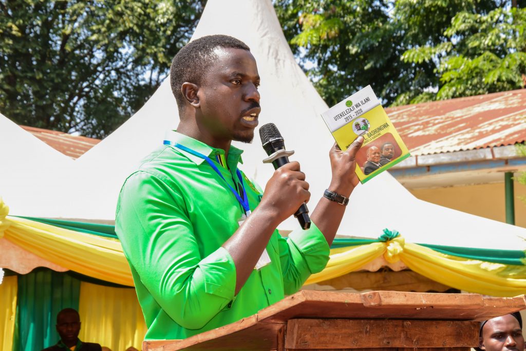 Waziri wa Viwanda na Biashara Mhe .Innocent Bashungwa akionesha kitabu caha utekelezaji wa ilani wa jimbo la karagwe katika kipindi cha miaka mitano 2015 – 2020 wakati wa kura za maoni katika mkutano mkuu wa Chama cha Mapinduzi jimbo la Karagwe mkoani Kagera
