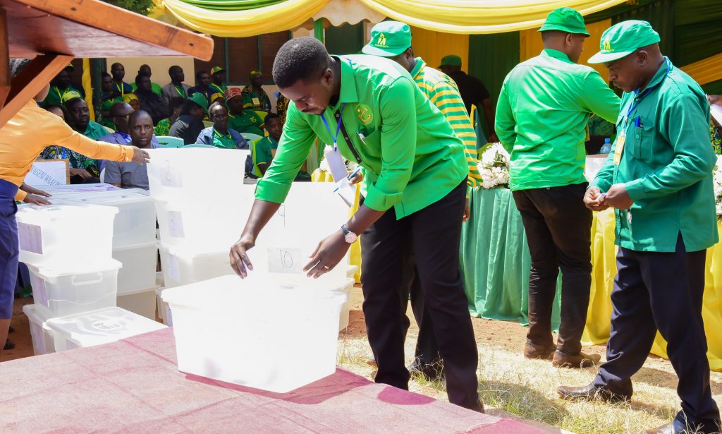 Waziri wa Viwanda na Biashara Mhe. Innocent Bashungwa akiweka kura yake kwenye sanduku la kukusanya kura za maoni katika mkutano mkuu wa Chama cha Mapinduzi jimbo la Karagwe mkoani Kagera.