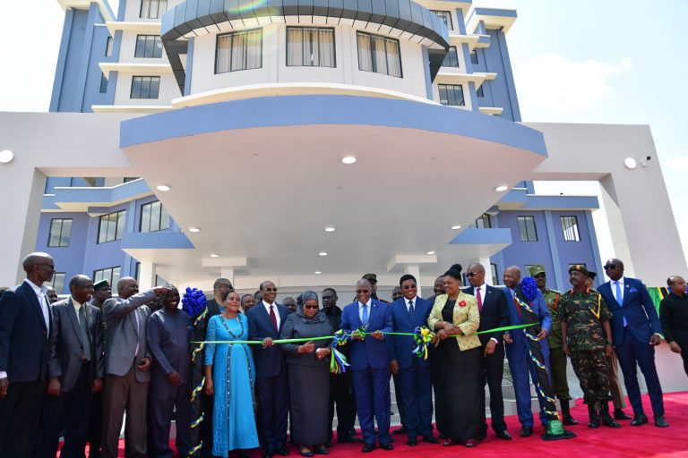 Rais wa Jamhuri ya Muungano wa Tanzania, Dkt. John Pombe Magufuli akikata utepe katika Uzinduzi wa Jengo la Tume ya Taifa ya Uchaguzi eneo la Ndejengwa Jijini Dodoma.“