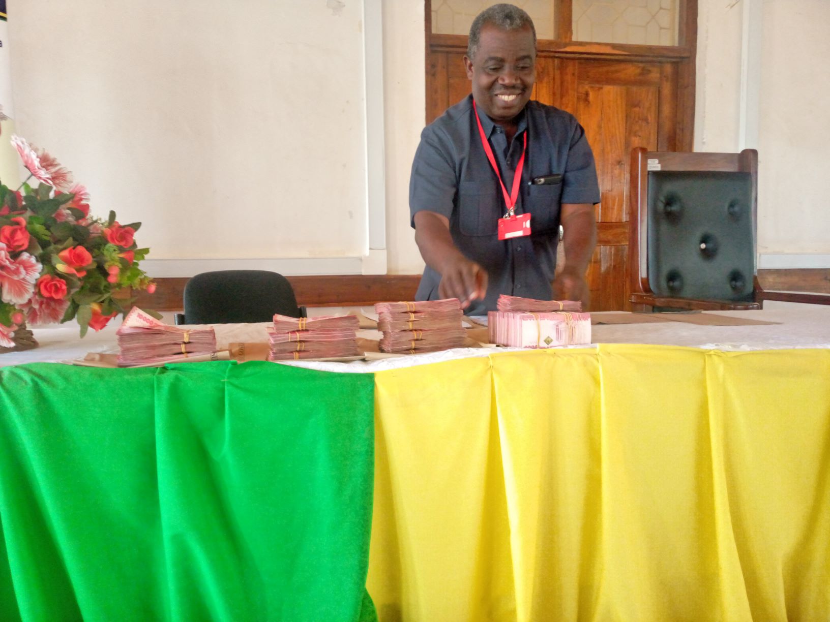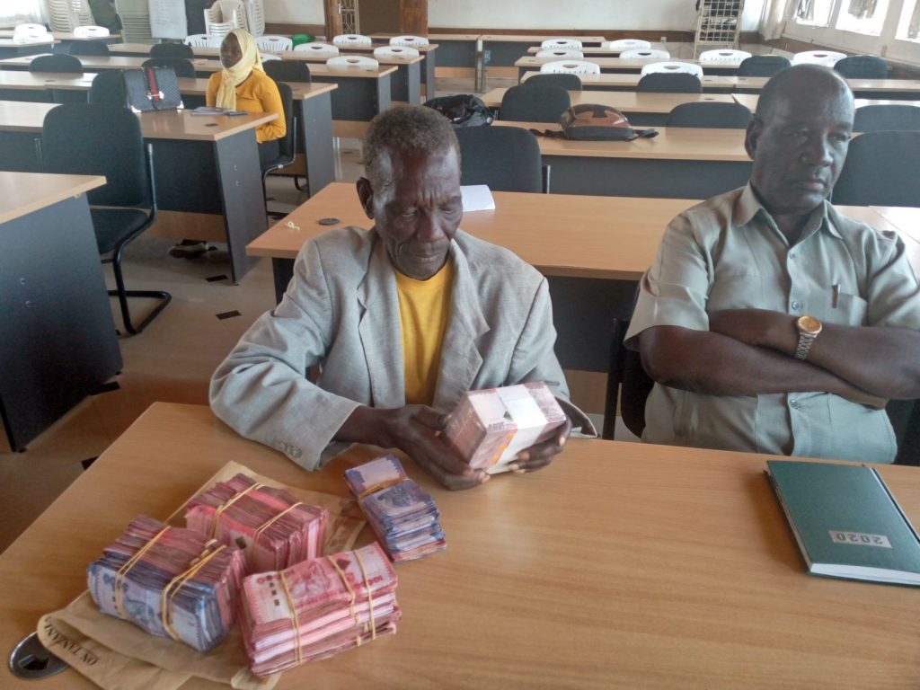 Mwalimu Mstaafu Bw. Elias Katinda akiesabu fedha zake zilizorejeshwa na TAKUKURU Mkoa wa Shinyanga baada yakuwa amepatiwa mikopo umiza kutoka makapuni mbalimbali ya biashara ukopeshaji.