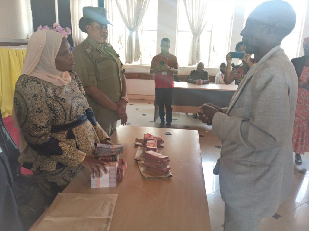 Mkuu wa Mkoa wa Shinyanga Bi. Zainab Telack akikabidhi fedha kwa Mwalimu Mstaafu Bw. Elias Katinda zilizorejeshwa na TAKUKURU Mkoa wa Shinyanga baada yakuwa amepatiwa mikopo umiza kutoka makapuni mbalimbali ya biashara ukopeshaji.