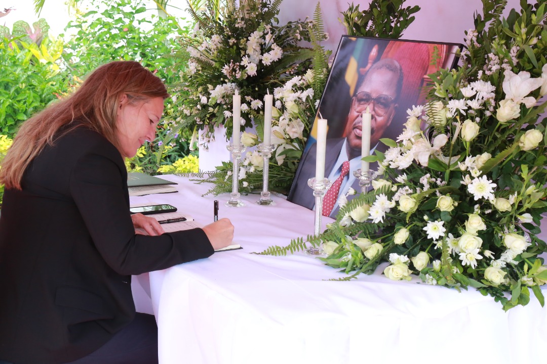 Balozi wa Denmark nchini Mhe. Mette Dissing-Spandet akisaini kitabu cha maombolezo nyumbani kwa Rais Mstaafu wa Tanzania Mzee Benjamin Mkapa leo tarehe 26 Julai 2020 jijini Dar es Salaam