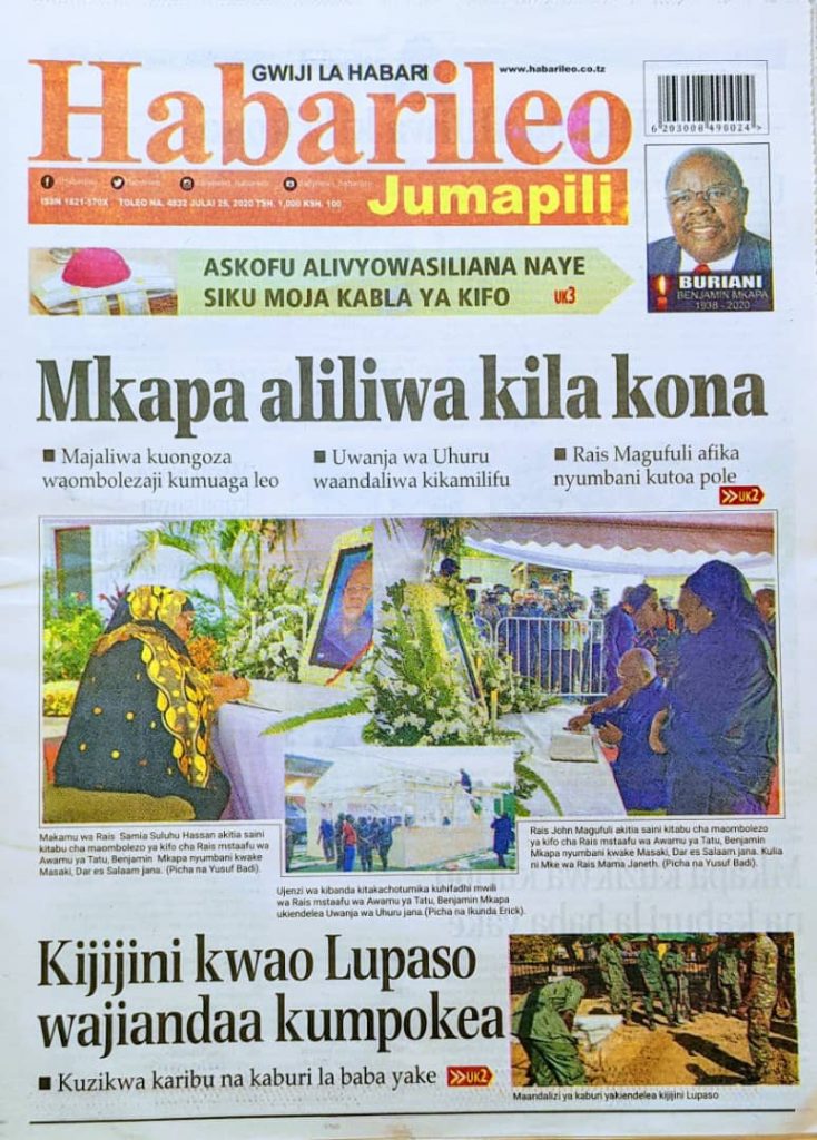 MagazetiPITIA VICHWA VYA HABARI KATIKA MAGAZETI YA LEO JULY 26,2020 Last updated: 2020/07/26 at 4:03 AM Alex Sonna 5 years ago Share SHARE Alex Sonna July 26, 2020 July 26, 2020 Share this Article Facebook Twitter Email Print Previous Article TAWA YAENDESHA KIKAO KAZI CHA UJIRANI MWEMA Next Article LIVE: RAIS MHE.MAGUFULI AKISHIRIKI MISA TAKATIFU YA KUMUOMBEA HAYATI MHE. BENJAMIN MKAPA UWANJA WA UHURU DAR ES SALAAM