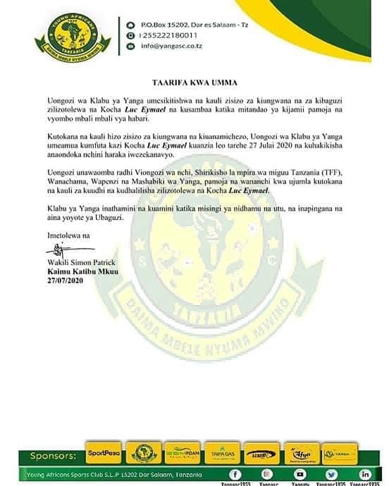 MichezoKAULI ZA KIBAGUZI ZAMUONDOA EYMAEL YANGA Last updated: 2020/07/27 at 8:29 AM joseph 5 years ago Share SHARE joseph July 27, 2020 July 27, 2020 Share this Article Facebook Twitter Email Print Previous Article VUNJO WAMPIGIA MAGOTI MBATIA AGOMBEE KWA MARA NYINGINE ,WAMCHANGIA FEDHA ZA FOMU Next Article TFF YATOA TAMKO LA KUMCHUKULIA HATUA ALIYEKUWA KOCHA WA YANGA KWA KAULI ZA KIBAGUZI