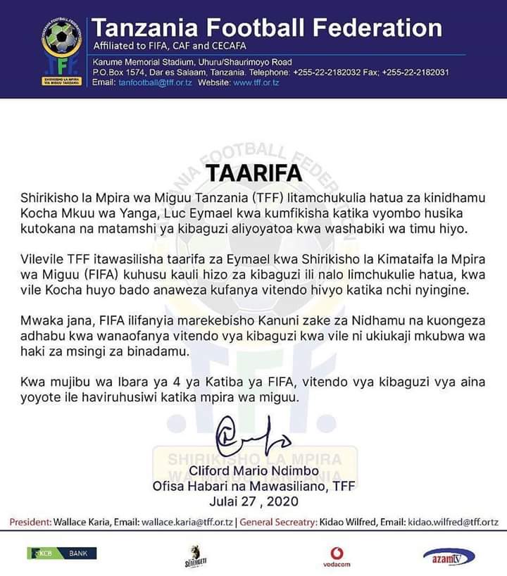 MichezoTFF YATOA TAMKO LA KUMCHUKULIA HATUA ALIYEKUWA KOCHA WA YANGA KWA KAULI ZA KIBAGUZI Last updated: 2020/07/27 at 10:49 AM Alex Sonna 5 years ago Share SHARE Alex Sonna July 27, 2020 July 27, 2020 Share this Article Facebook Twitter Email Print Previous Article KAULI ZA KIBAGUZI ZAMUONDOA EYMAEL YANGA Next Article Mkuu wa mkoa wa Tanga Shigela akitoa heshima za mwisho kwa Hayati Benjamin Mkapa