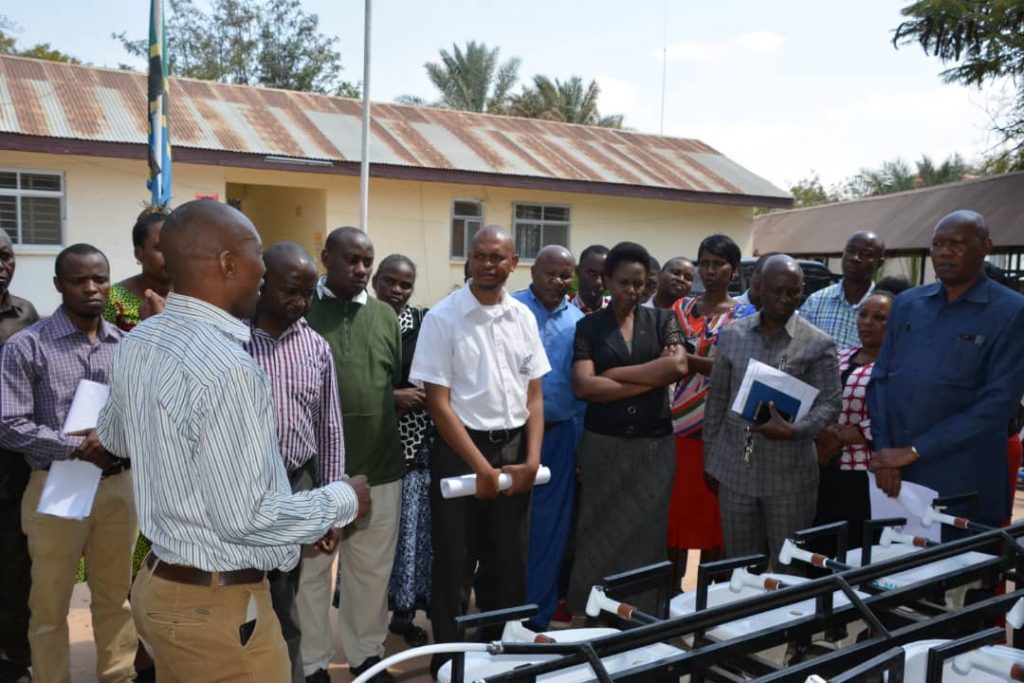 Mhandisi Nyangusi Matalani ( kushoto) akielekeza jinsi ya kutumia vifaa vya kunawia mikono kwa ajili ya shule 22 za Jiji la Dodoma wakati wa makabidhiano yaliyofanyika kati ya Wizara ya Afya na shirika la Compassion.