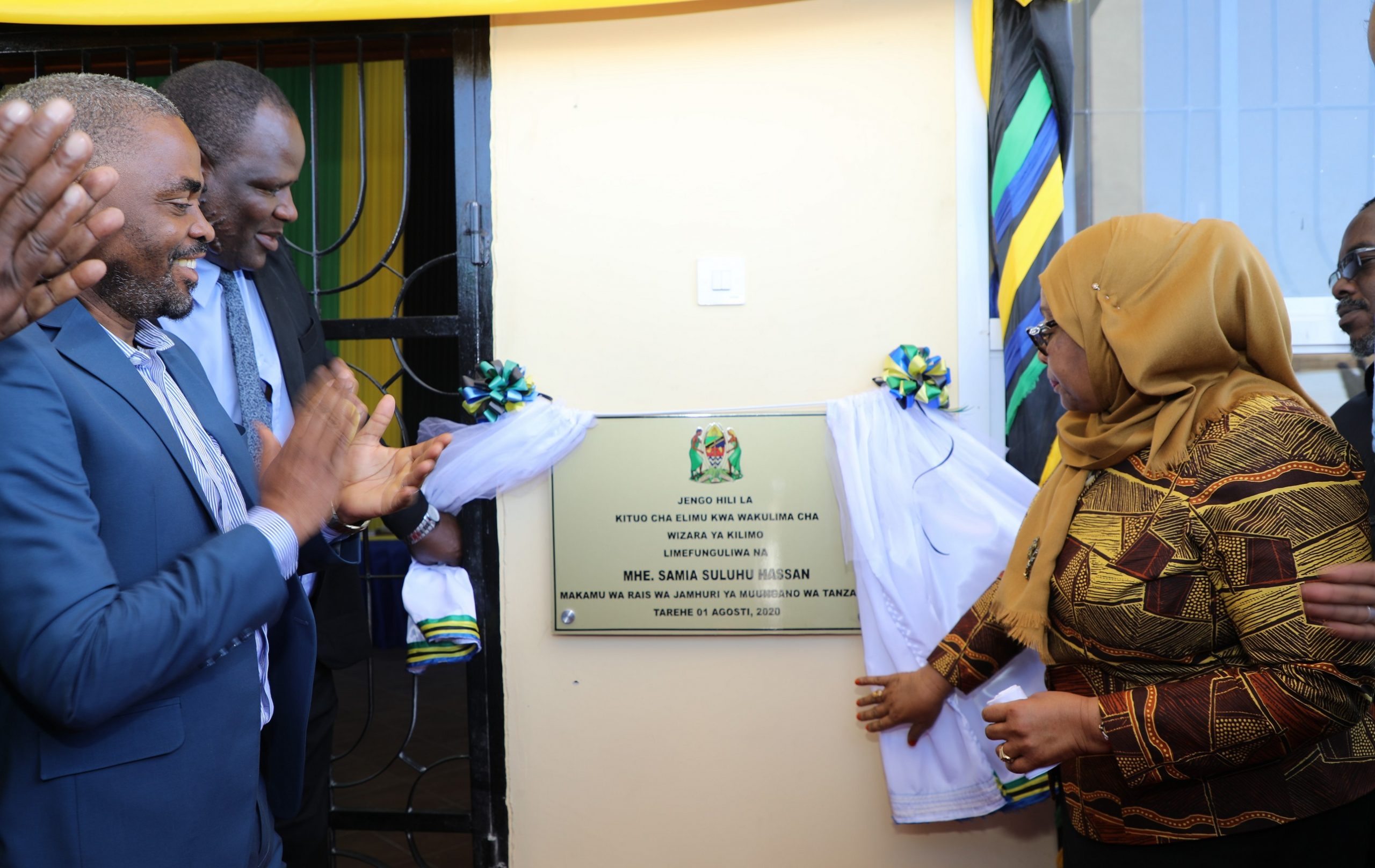 Makamu wa Rais wa Jamhuri ya Muungano wa Tanzania Mhe. Samia Suluhu Hassan, akizindua Jengo la Kituo cha Elimu kwa Wakulima Kanda ya Ziwa Mashariki wakati wa Uzinduzi wa Sikukuu ya Wakulima Nanenane iliyofanyika leo Kitaifa katika Viwanja vya Nyakabindi Mkoani Simiyu. ambapo ujumbe wa mwaka huu Nanenane kwa maendeleo ya Kilimo, Mifugo na Uvuvi Chagua Kiongozi Bora 2020.