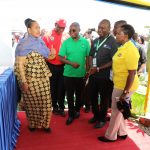 Afisa Uhusiano Mwandamizi wa WCF, Sebera Fulgence (kulia), akimfafanulia jambo mfanyakazi huyu aliyetembelea banda la WCF viwanja vya Nyakabindi mkoani Simiyu Agosti 3, 2020.