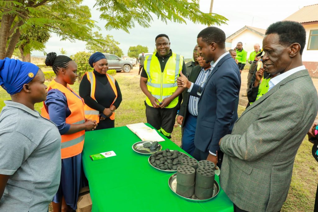 Waziri wa Viwanda na Biashara Mhe. Innocent Bashungwa akiongea na kikundi za wamama kinachofanya kazi ya kuaanda mkaa wa kupikia kwa kutumia malighafi za makaa ya mawe kutoka kwenye mgodi wa Ngaka uliopo eneo la Ruanda wilaya ya Mbinga Mkoani Ruvuma.