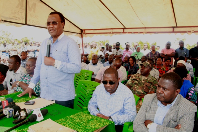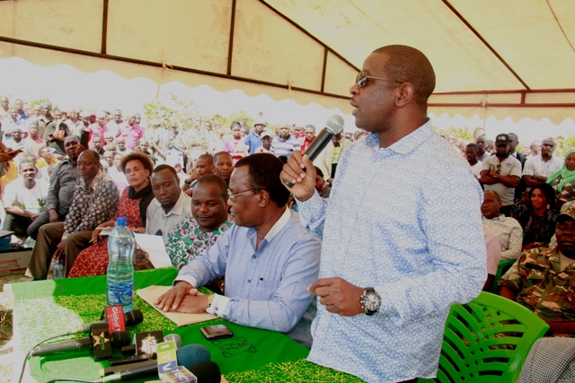 Naibu Waziri wa Uvuvi na Mifugo na aliyekuwa mbunge wa jimbo la Mkuranga Bw. Abdalla Ulega akizungumza katika katika mkutano wa hadhara wakati Waziri wa Ardhi nyumba na Makazi Mh.Willam Lukuvi alipotoa taarifa ya kufuta umiliki wa mashamba ya kijiji cha Kazole wilayani Mkuranga yaliyokuwa yakimilikiwa na kampuni ya Soap and Allied Industrie.