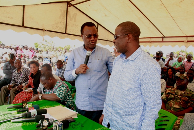 Waziri wa Ardhi nyumba na Makazi Mh.Willam Lukuvi akizungumza na Naibu Waziri wa Uvuvi na Mifugo na aliyekuwa mbunge wa jimbo la Mkuranga Bw. Abdalla Ulega katika mkutano wa hadhara wakati alipotoa taarifa ya kufuta umiliki wa mashamba ya kijiji cha Kazole wilayani Mkuranga yaliyokuwa yakimilikiwa na kampuni ya Soap and Allied Industries