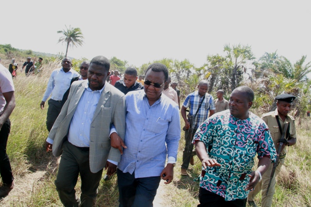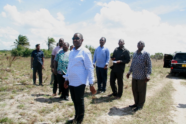 Waziri wa Ardhi nyumba na Makazi Mh.Willam Lukuvi akizungumza na Mkuu wa wilaya ya Mkuranga Filberto Sanga kushoto ni Mkurugenzi wa wilaya ya Mkuranga Bw. Mshamu Ally Munde pamoja na viongzo wengine wakikagua mashamba hayo.