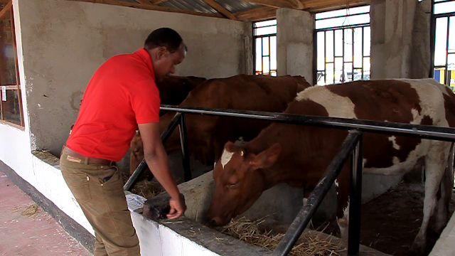 Afisa Ugani wa JKT, Kizito Shita akionesha namna ya kuwalisha ng’ombe wa maziwa.