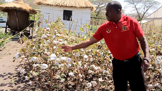Mwenyekiti wa Kamati ya Maandalizi ya Nanenane Kitaifa wa Jeshi la Kujenga Taifa (JKT) Luteni Kanali Peter Lushika akionesha shamba la mfano la pamba katika Maonesho ya 27 Nanenane Kitaifa yanayofanyika Nyakabindi mkoani Simiyu.