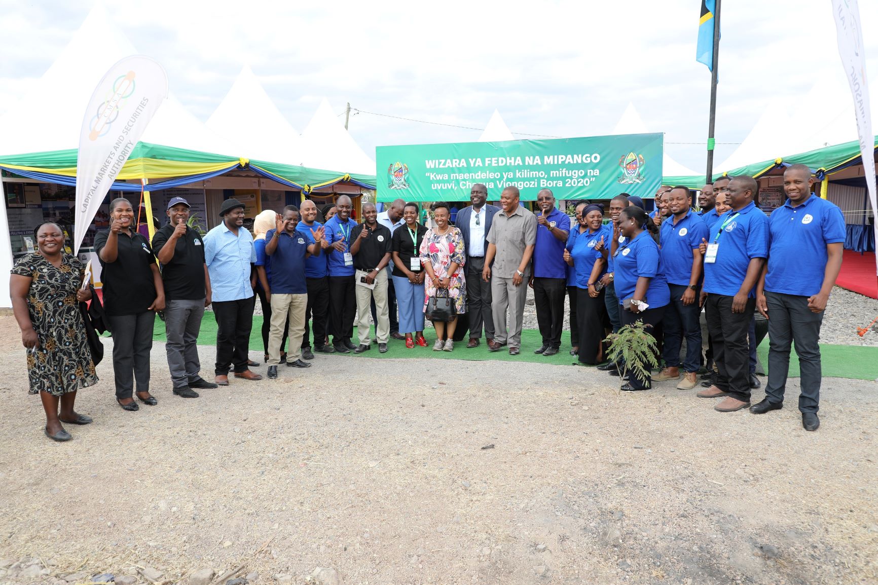 Mkuu wa Mkoa wa Simiyu Antony Mtaka (wa nane kulia), Mkuu wa Chuo cha Usimamizi wa Fedha (IFM) Prof. Tadeo Satta (wa tisa kulia), Mkuu wa Kitengo cha Mawasiliano Serikalini Wizara ya Fedha na Mipango, Bw. Benny Mwaipaja (wa saba kuli), wakiwa katika picha ya pamoja na watumishi wa Wizara ya Fedha, baada ya kutembelea Banda la Wizara hiyo katika Maonesho ya Nanenane yanayofanyika Kitaifa katika Viwanja vya Nyakabindi, Mkoani Simiyu.