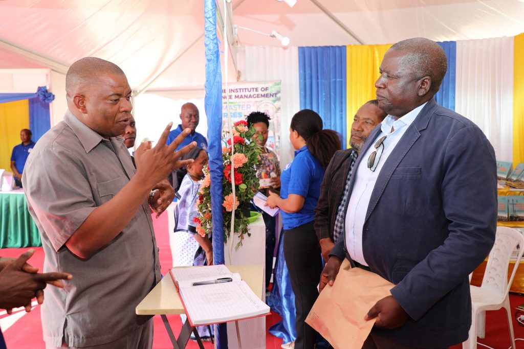Mkuu wa Chuo cha Usimamizi wa Fedha (IFM) Prof. Tadeo Satta (kulia) akisikiliza ushauri kuhusu Vyuo kusaidia usimamizi wa maandiko ya miradi kutoka kwa Mkuu wa Mkoa wa Simiyu, Bw. Antony Mtaka (kushoto), alipotembelea Banda la Wizara ya Fedha na Mipango, katika Maonesho ya Nanenane yanayofanyika Kitaifa katika Viwanja vya Nyakabindi, Mkoani Simiyu.
