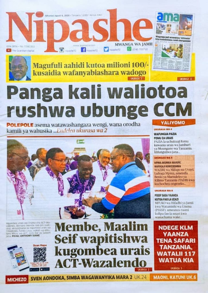 MagazetiPITIA VICHWA VYA HABARI KATIKA MAGAZETI YA LEO AUGUST 6,2020 Last updated: 2020/08/06 at 3:24 AM Alex Sonna 5 years ago Share SHARE Alex Sonna August 6, 2020 August 6, 2020 Share this Article Facebook Twitter Email Print Previous Article TAASISI YA CHAKULA NA LISHE YATOA MAFUNZO KWA WANAHABARI MAADHIMISHO WIKI YA UNYONYESHAJI WA MAZIWA YA MAMA Next Article WANANCHI WAJITOKEZA KWA WINGI KATIKA BANDA LA UDSM KWENYE MAONESHO YA WAKULIMA NANE NANE YANAYOENDELEA MKOANI SIMIYU