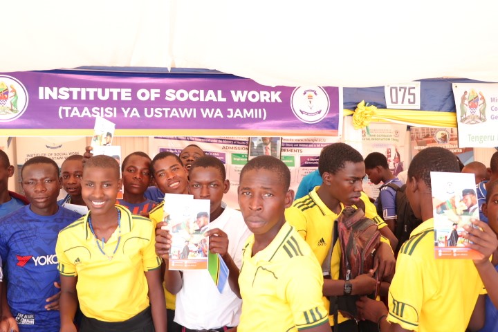 Wanafunzi wa shule ya Sekondari Mahaha ya Bariadi mkoani Simiyu wakiwa na nyuso za furaha baada ya kutapa maelezo ya kozi inazotolewa na Taasisi na kujua kuwa wao ni wanafunzi watarajiwa wa elimu ya juu wa Taasisi ya Ustawi wa Jamii na kila mmoja wao kupata nakala ya vipeperushi vya Taasisi ya Ustawi wa Jamii vinavyotolewa kwa wateja wote wanaofika katika dawati la huduma.