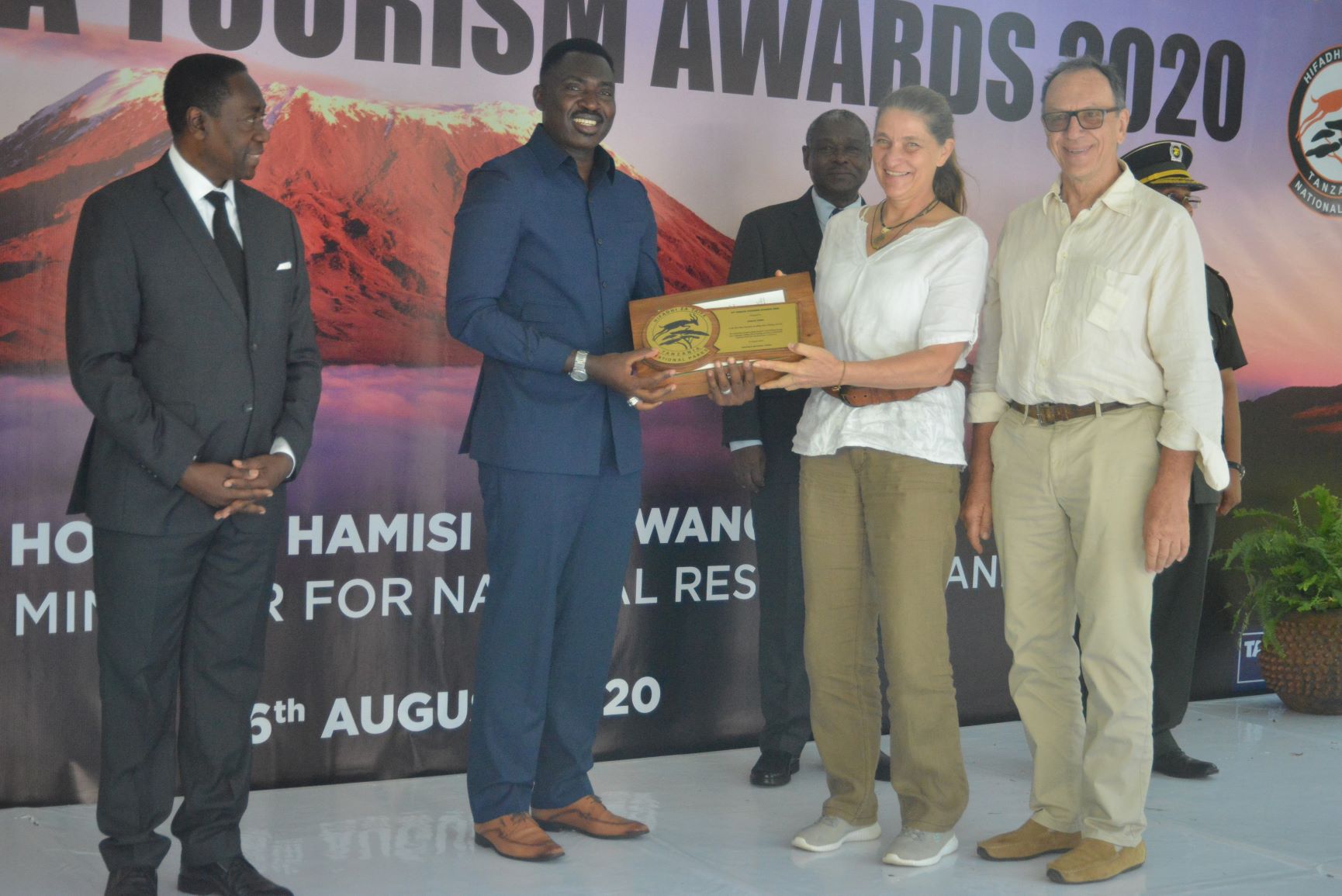 Waziri wa Maliasili na Utalii, Dkt. Hamisi Kigwangalla akitoa Tuzo ya utoaji huduma Bora za Utalii ya TANAPA 2020 kwa Mmiliki na Mwanzilishi wa Kampuni ya Zara Tours, Zainab Ansell leo jijini Arusha. Wengine wanaoshuhudia Kutoka kushoto ni Katibu Mkuu wa Wizara ya Maliasili na Utalii Dkt. Aloyce Nzuki, Mwenyekiti wa Bodi ya Wadhamini ya TANAPA, Mkuu wa Majeshi Mstaafu Jenerali George Waitara na Naibu Katibu Mkuu wa Wizara ya Maliasili na Utalii Dkt. Allan Kijazi.