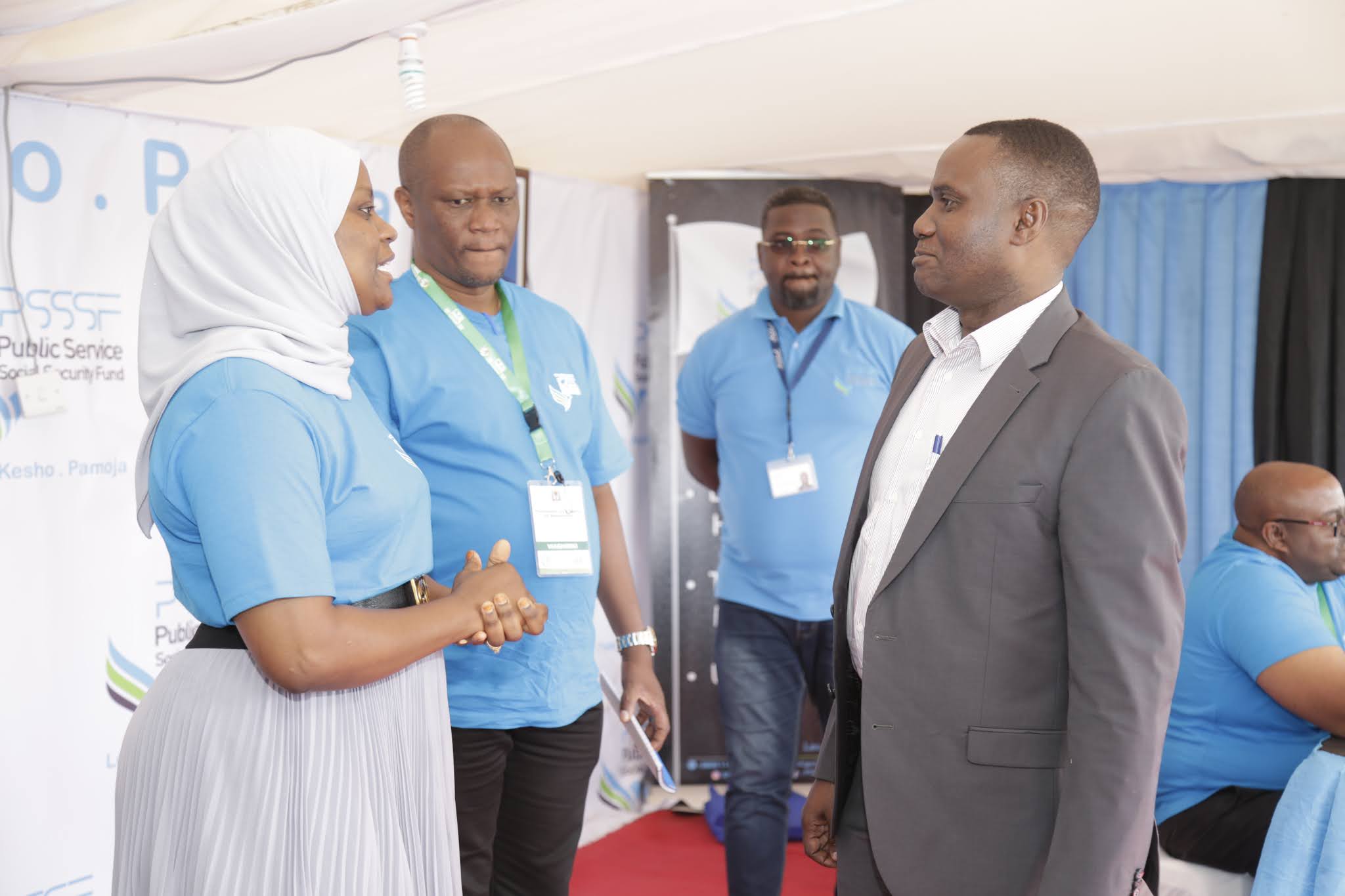 Mkurugenzi Mkuu wa Mfuko was Fidia kwa Wafanyakazi (WCF), Bw. Masha Mshomba (wakwanza kulia) na Mkurugenzi Mkuu wa Mfuko wa Taifa wa Bima ya Afya (NHIF) Bw. Bernard Konga wakiangalia michango yao kwenye Mfuko wa Hifadhi ya Jamii kwa Watumishi wa Umma (PSSSF) huhu wakipata usaidizi kutoka kwa Afisa Uhusiano Mwandamizi wa Mfuko huo, Bi. Rehema Mkamba, kwenye maonesho ya Nanenane viwanja vya Nyakabindi Mkoani Simiyu.
