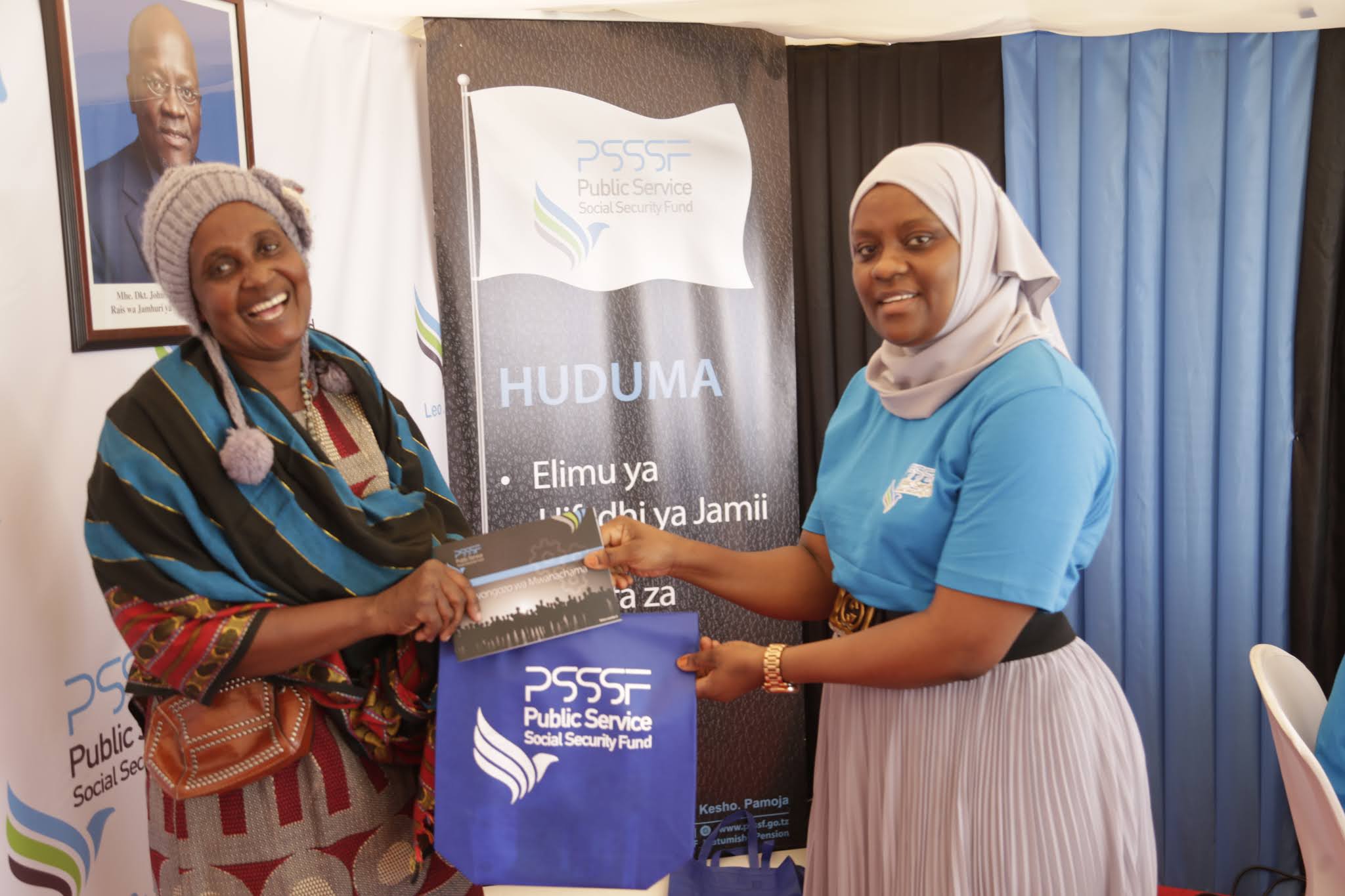 Ngolo Halage Masibu (kushoto) ambaye ni mstaafu wilayani Bariadi mkoa wa Simiyu, akipokea mfuko wenye taarifa mbalimbali kuhusu PSSSF