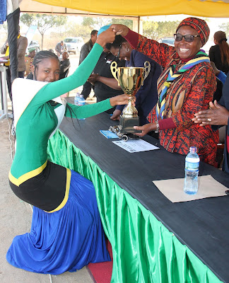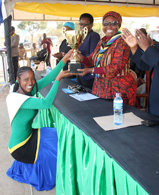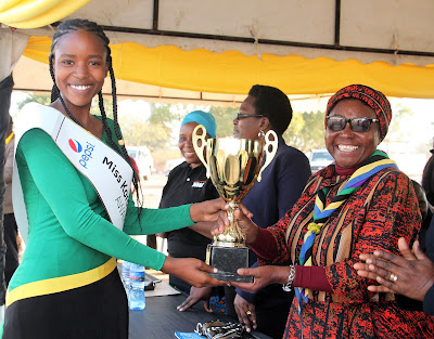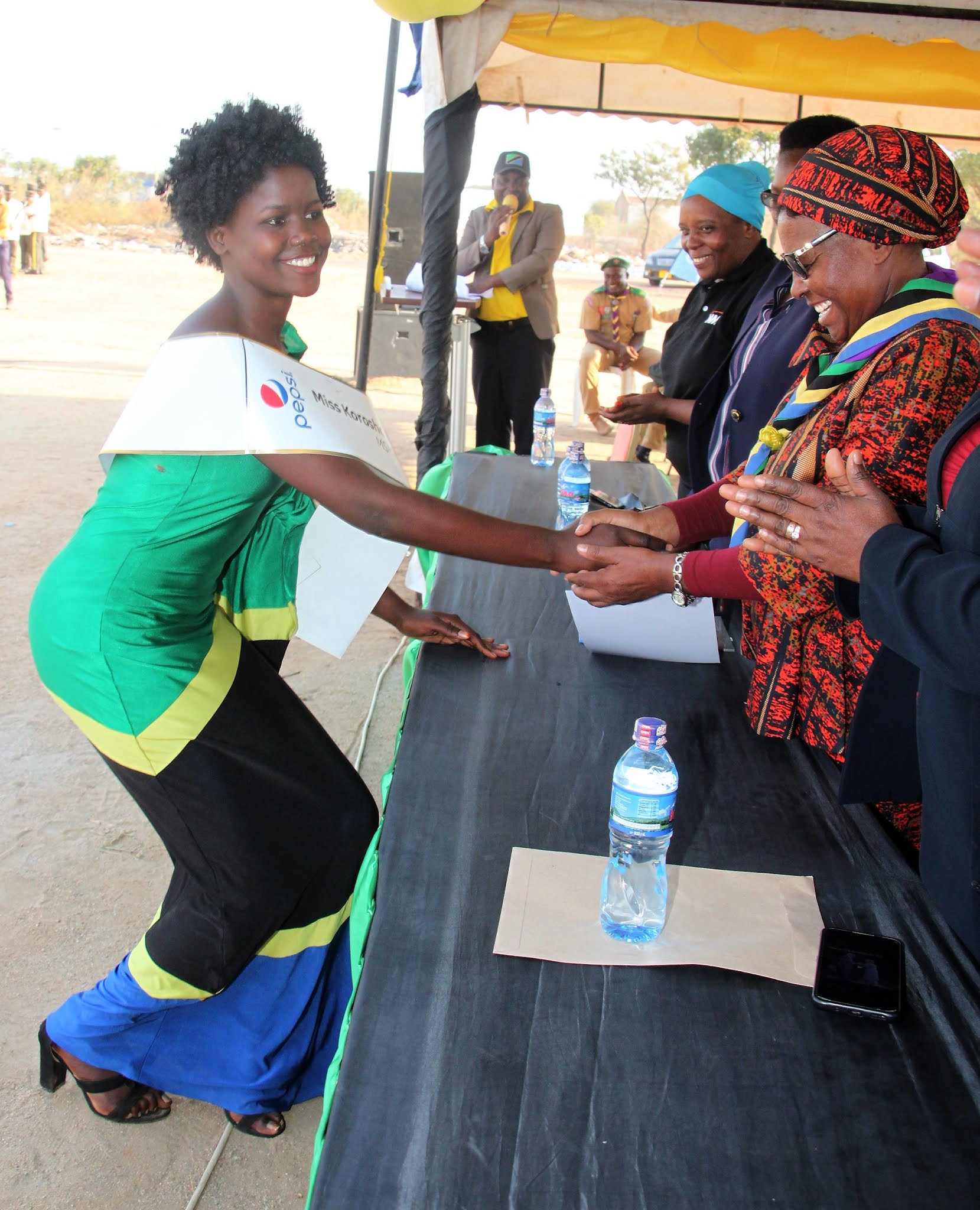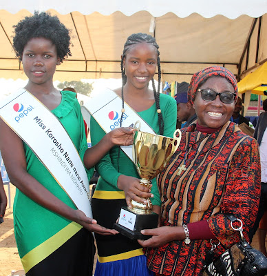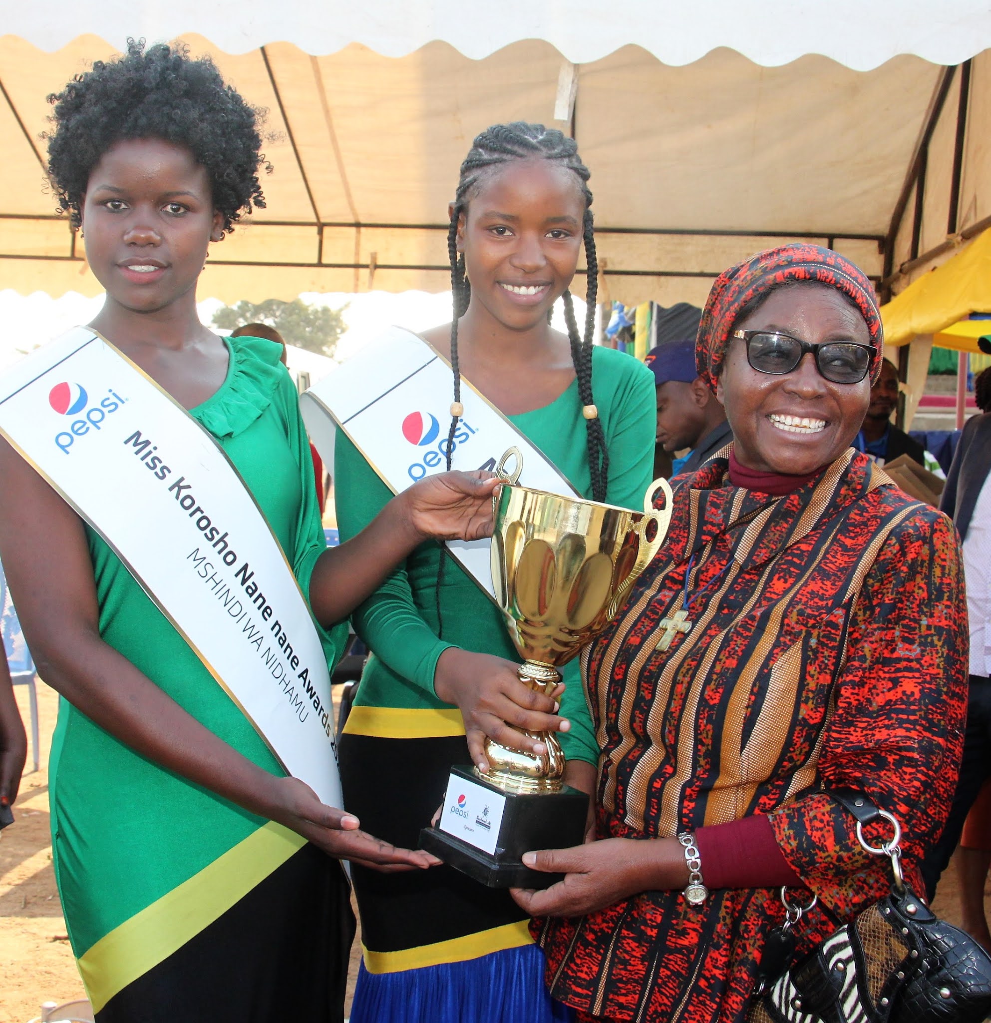 Mkuu wa Mkoa wa Singida D. Rehema Nchimbi akimpongeza Lenada Jackson ambaye alikuwa msindi wa Nidhamu wa mMashindano yayo ya Miss Korosho.
