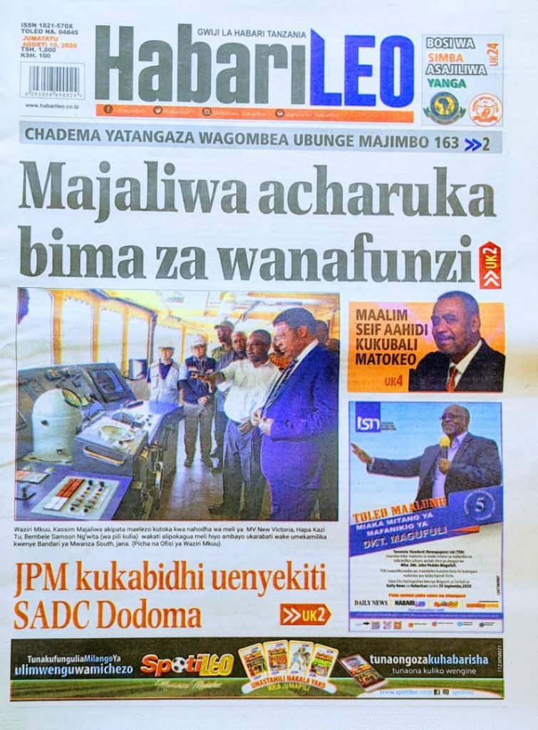 MagazetiUncategorizedPITIA VICHWA VYA HABARI KATIKA MAGAZETI YA LEO AUGUST 10,2020 Last updated: 2020/08/10 at 3:32 AM Alex Sonna 5 years ago Share SHARE Alex Sonna August 10, 2020 August 10, 2020 Share this Article Facebook Twitter Email Print Previous Article JPM BODA BODA CUP 2020 YAANZA RASMI KAGERA MILIONI 8 KUSHINDANIWA. Next Article AFISA TARAFA ITISO ATOA ELIMU KWA VIONGOZI WAKE WA KIJIJI KUPATA UELEWA JUU YA KILIMO
