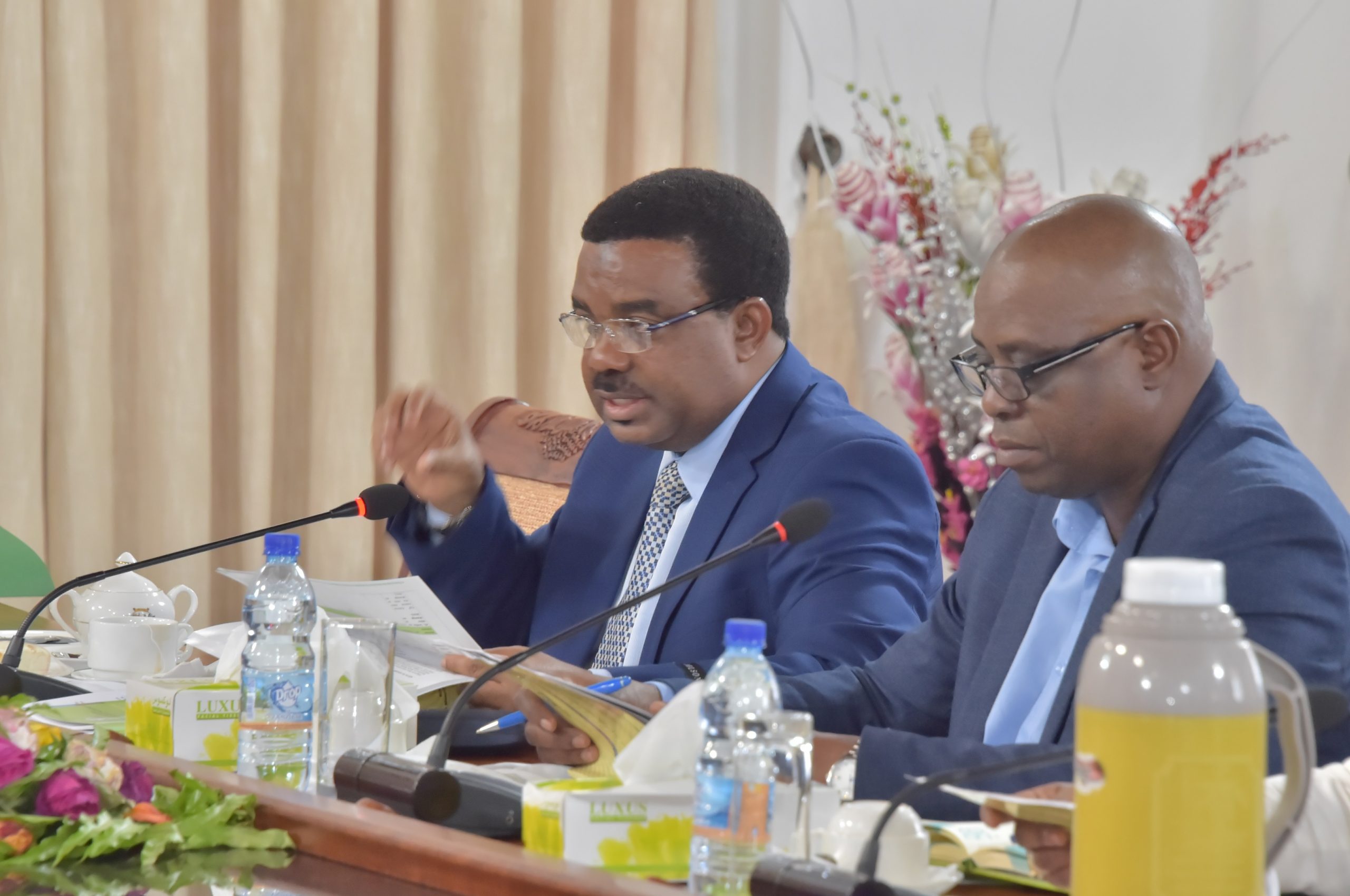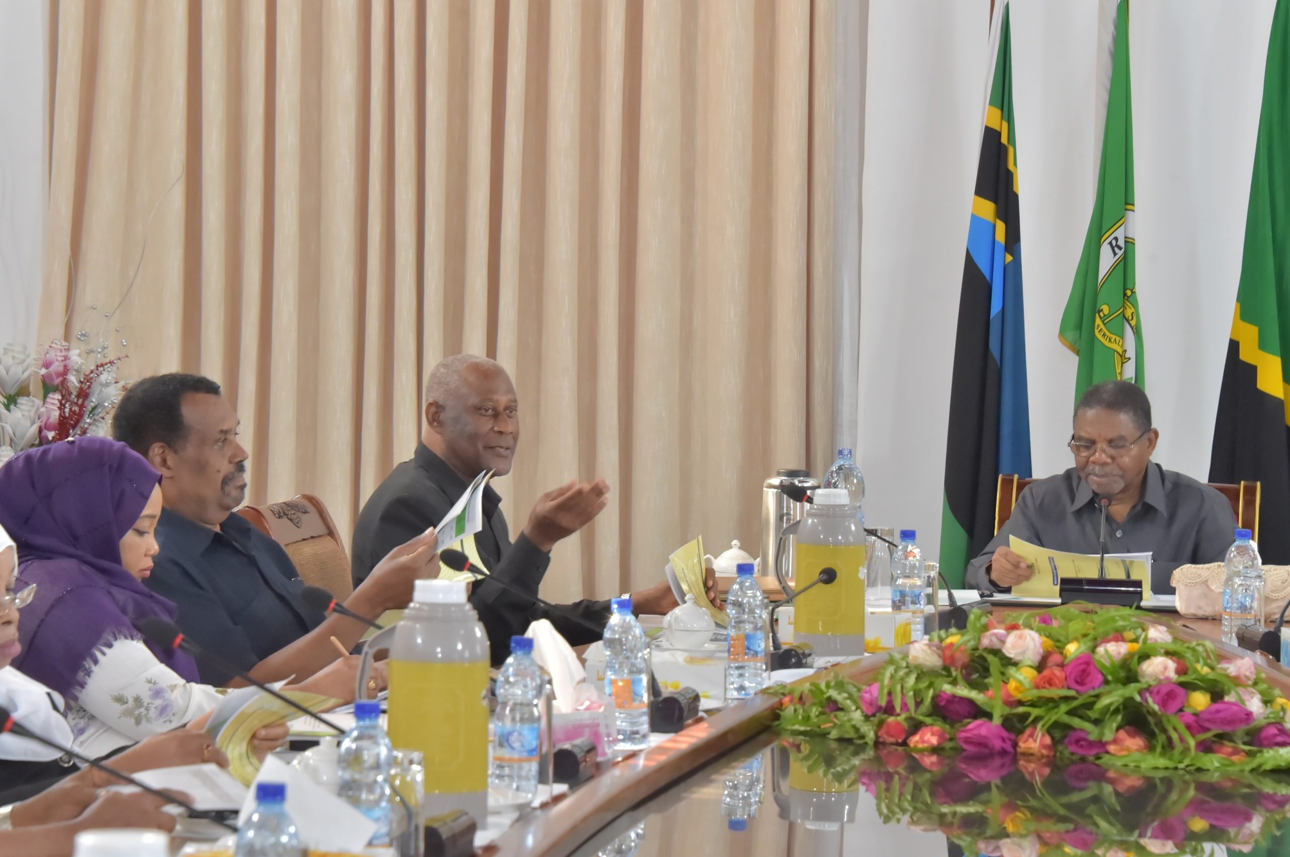 Katibu Mkuu wa Baraza la Mapinduzi na Katibu Mkuu Kiongozi Dkt.Abdul Yahya Mzee (katikati) alipokuwa akichangia katika Kikao cha Utekelezaji Mpango kazi wa Mwaka 2020/2021 cha Wizara ya Vijana,Utamaduni,Sanaa na Michezo kilichofanyika leo katika Ukumbi wa Mikutano Ikulu Mjini Zanzibar chini ya Mwenyekiti wake Rais wa Zanzibar na Mwenyekiti wa Baraza la Mapinduzi Dk.Ali Mohamed Shein (kulia).[Picha na Ikulu] 11/08/2020.
