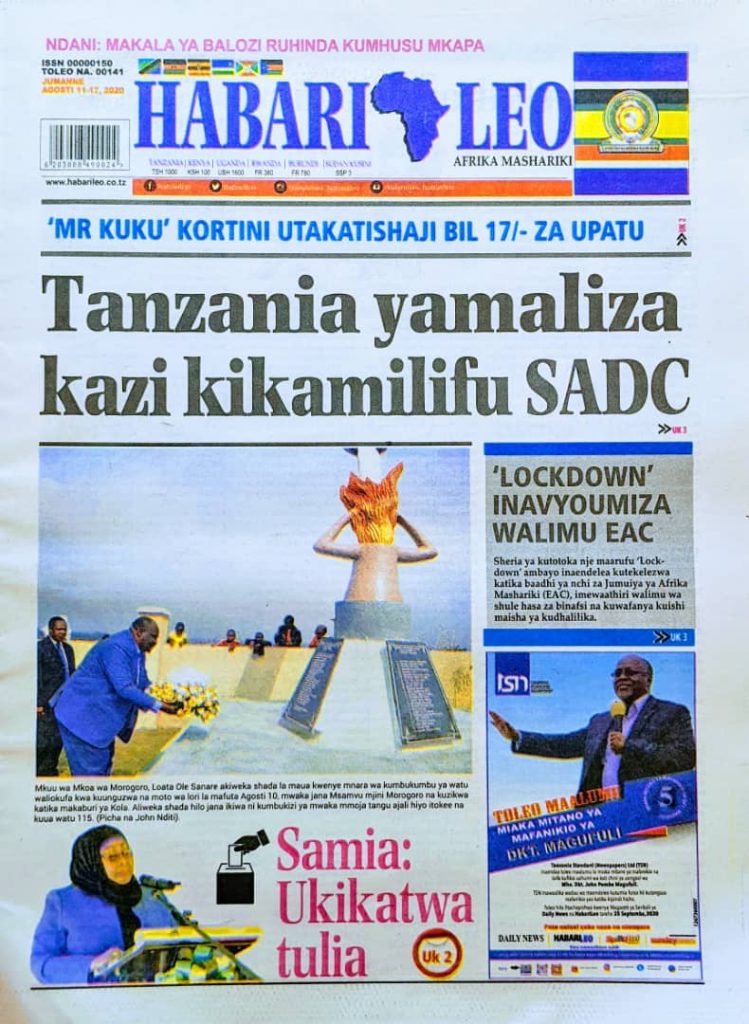 MagazetiPITIA VICHWA VYA HABARI KATIKA MAGAZETI YA LEO AUGUST 11,2020 Last updated: 2020/08/11 at 3:16 AM Alex Sonna 5 years ago Share SHARE Alex Sonna August 11, 2020 August 11, 2020 Share this Article Facebook Twitter Email Print Previous Article WATUMISHI WIZARA YA MALIASILI NA UTALII WAKISHEREHEKEA USHINDI MAONESHO YA NANENANE DODOMA Next Article NAIBU WAZIRI MABULA AWATAKA WATENDAJI ARDHI KUTOA ELIMU YA SHERIA MPYA YA FEDHA KUHUSU UMILIKISHAJI ARDHI