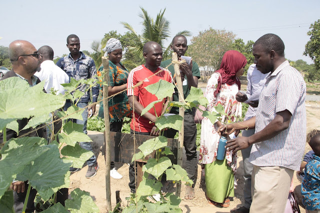 Mkufunzi Kilimo wa Chuo cha Mafunzo ya Kilimo cha Mati Mtwara, Mawazo Gadafi (kulia) akizungumza na wananchi waliotembelea shamba la mfano la matango chuo hicho wakati wa Maonesho ya NaneNane 2020 yaliyofikia tamati hivi karibuni katika viwanja vya Ngongo mkoani Lindi.