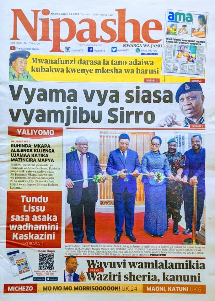 MagazetiPITIA VICHWA VYA HABARI KATIKA MAGAZETI YA LEO AUGUST 13,2020 Last updated: 2020/08/13 at 3:46 AM Alex Sonna 5 years ago Share SHARE Alex Sonna August 13, 2020 August 13, 2020 Share this Article Facebook Twitter Email Print Previous Article WAZIRI KALEMANI AAGIZA MKANDARASI KUKATWA BILIONI 4.76 KWA KUCHELEWESHA KUKAMILISHA MRADI WA UMEME Next Article WAZIRI MBARAWA AZITAKA MAMLAKA ZA MAJI KUACHANA NA WAKANDARASI