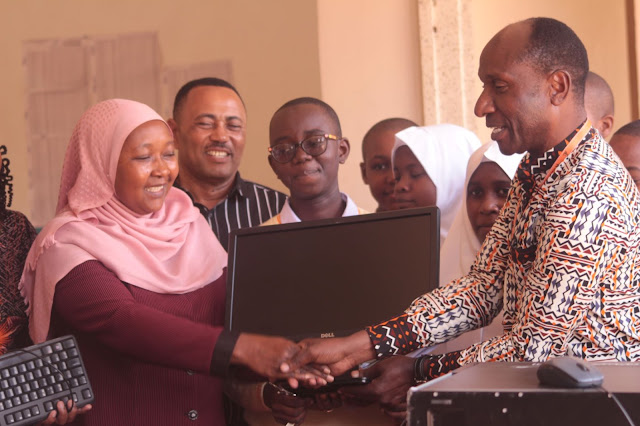 Mwalimu wa taaluma wa Shule ya Sekondari ya Jangwani, Hussein Juma akizungumza mara baada ya kupewa msaada wa kompyuta.