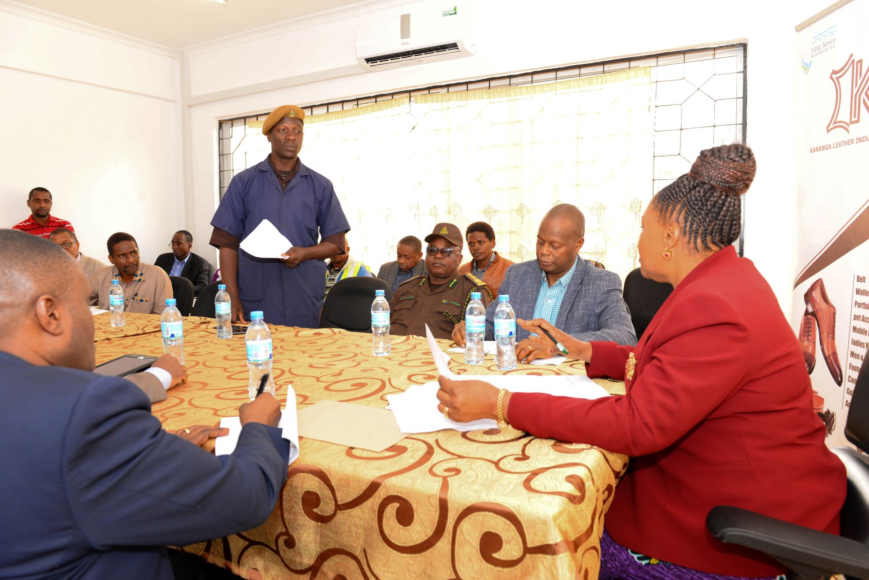 Katibu Mkuu, Ofisi ya Waziri Mkuu – Kazi, Vijana, Ajira na Wenye Ulemavu Bw. Andrew Massawe akieleza jambo wakati wa kikao kifupi cha upokeaji wa taarifa ya utekelezaji wa mradi wa Ujenzi wa Kiwanda cha bidhaa za ngozi cha Karanga.