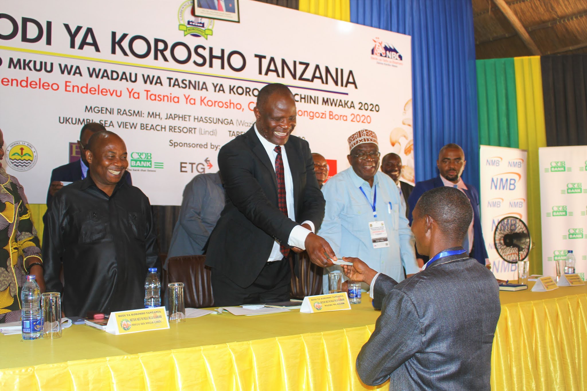 Waziri wa Kilimo Japhet Hasunga akimkabidhi kitambulisho mkulima bora wa zao la Korosho wakati wa ufunguzi wa mkutano Mkuu wa Wadau wa Korosho mkoani Lindi.Mkuu wa Mkoa wa Mtwara Mhe Gelasius