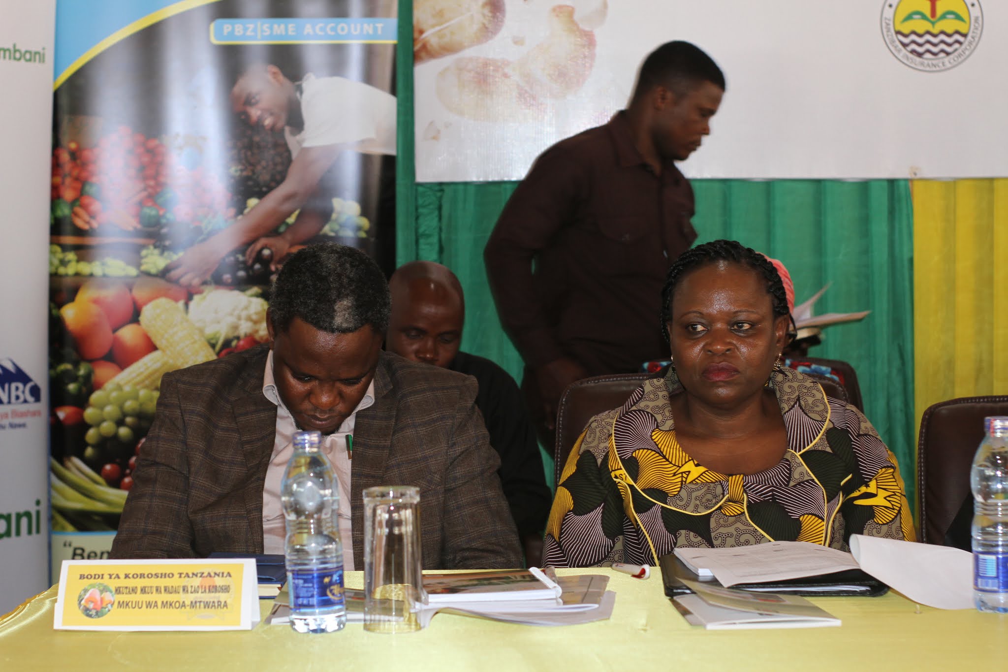 Byakanwa (Kushoto) na Mhe Christina Mndeme Mkuu wa mkoa wa Ruvuma(Kulia) wakufuatilia hotuba wa Waziri wa Kilimo katika ufunguzi wa Mkutano Mkuu wa Wadau wa Korosho