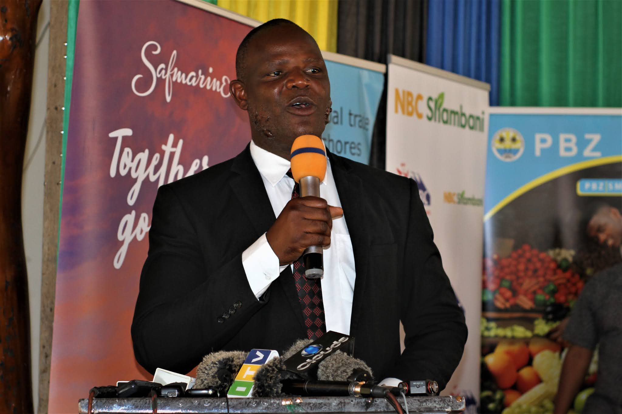 Waziri wa Kilimo Japhet Hasunga akisisitiza jambo wakati wa ufunguzi wa mkutano Mkuu Mkuu Mkuu wa Korosho Mkoani Lindi tarehe 15 Agosti 2020. (Picha Na Innocent Natai)