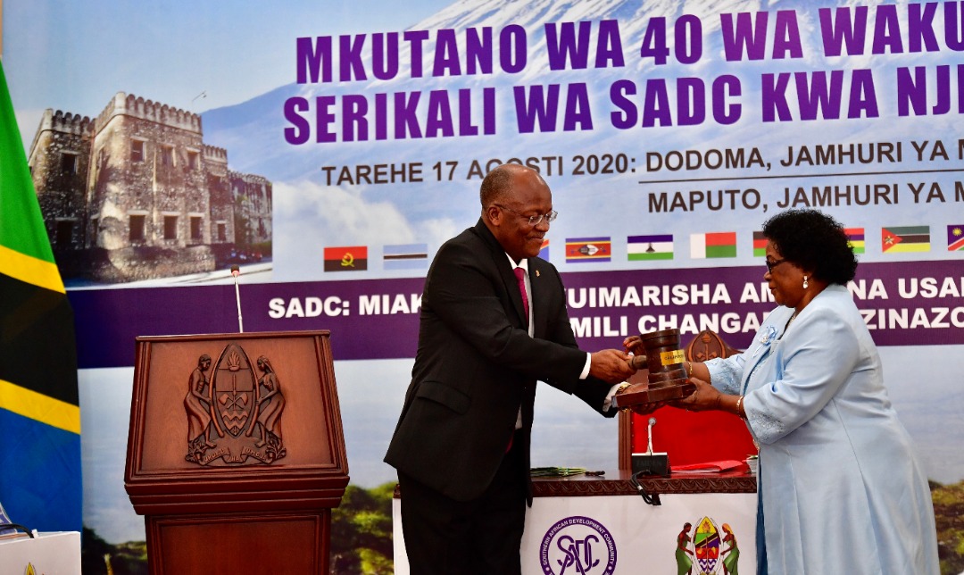 Rais wa Jamhuri ya Muungano wa Tanzania na Mwenyekiti wa Jumuiya ya Maendeleo Kusini mwa Afrika (SADC) Mheshimiwa Dkt. John Pombe Magufuli akikabidhi Uenyekiti wa (SADC) kwa Balozi wa Msumbiji hapa nchini Monica Patricio Clemente ambaye alipokea kwa niaba ya Rais wa Msumbiji Filipe Jacinto Nyusi katika Ikulu ya Chamwino Mkoani Dodoma.