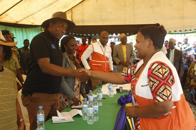 MKUU wa wilaya ya Hanadeni Toba Nguvila kushoto akimpongeza Mratibu wa Mradi wa Maendeleo Kwamsisi wa Shirika la World Vision