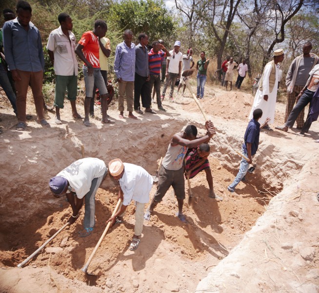 Baadhi ya wananchi wa Kwamtoro wakishiriki katika ujenzi wa vyoo vya Bweni la Wanafunzi, Sekondari ya Kwamtoro.